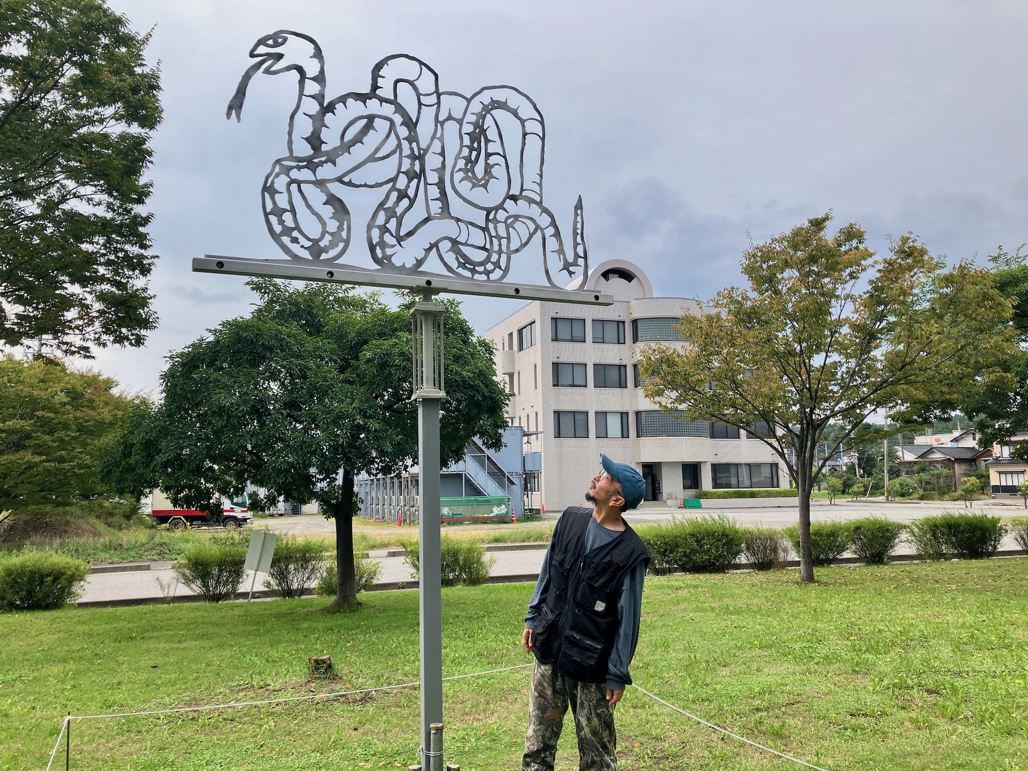 この日は煙突の上で膨らむ「わ」の文字が私たちを迎えてくれた。銭湯のボイラーから出る熱だけで巨大な「わ」の字を気球のように膨らませた作品《仮(わ)》(このタイトルはその場で新谷と楓が命名)。昔の銭湯で営業中にお湯が沸いたことを示す「わ」と書かれた板を掲げていたことにちなみ、循環の輪や、「わっと驚く」といった様々な意味が込められている。本作は「ROAD TO NOTO」プログラムの開催にあわせて膨らませる予定だというが、「“わ”が出たらみんなが、『あ、お風呂やってるんだな』ってわかるようなシンボルになれば」と今後の展示も見据えている。