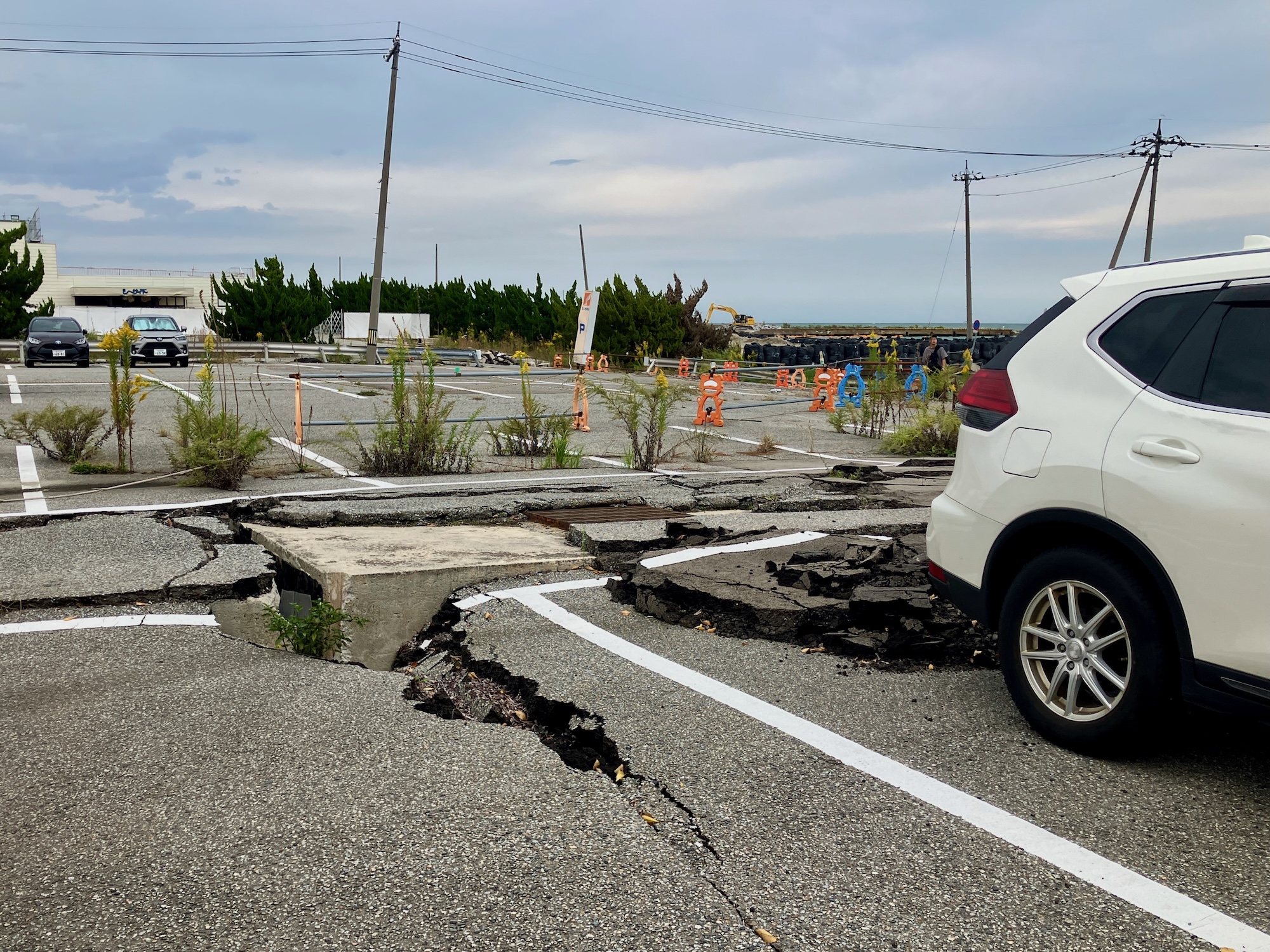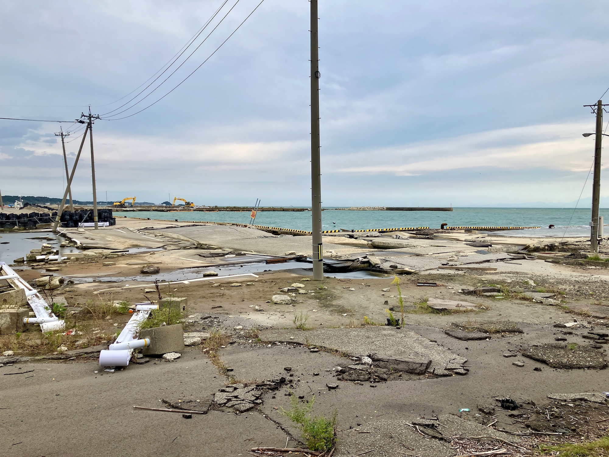 ラポルトすずに面した飯田港も地震と津波で防波堤が破壊されるなどの甚大な被害があった。この場所にはかつて「奥能登国際芸術祭」のインフォメーションセンターとしても活用された「さいはてのキャバレー」があったが、4m近い津波を受けて建物がダメージを受け、港の復旧工事のため公費解体された。ひび割れた地面や傾いた電柱、倒れたガードレールなど、震災から1年以上が経ってもなお、その爪痕が残っている。