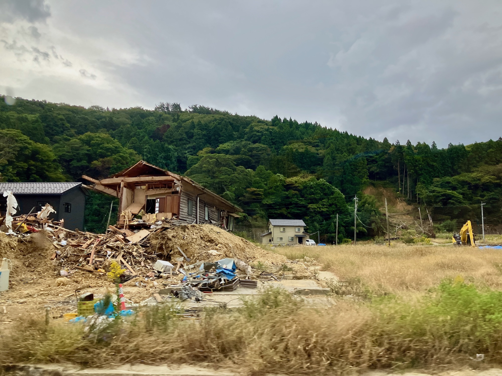 ここまでが、富山湾に面した「内浦」エリア。ここから日本海側の「外浦」にある大谷地区へと30分ほどバスは走る。大谷地区は元日の震災に続き、9月の豪雨でも大きな被害を受けた。大規模な土砂崩れなどが発生し、現在は復旧工事が進められている。多くの家が解体され、街の風景は様変わりした。
