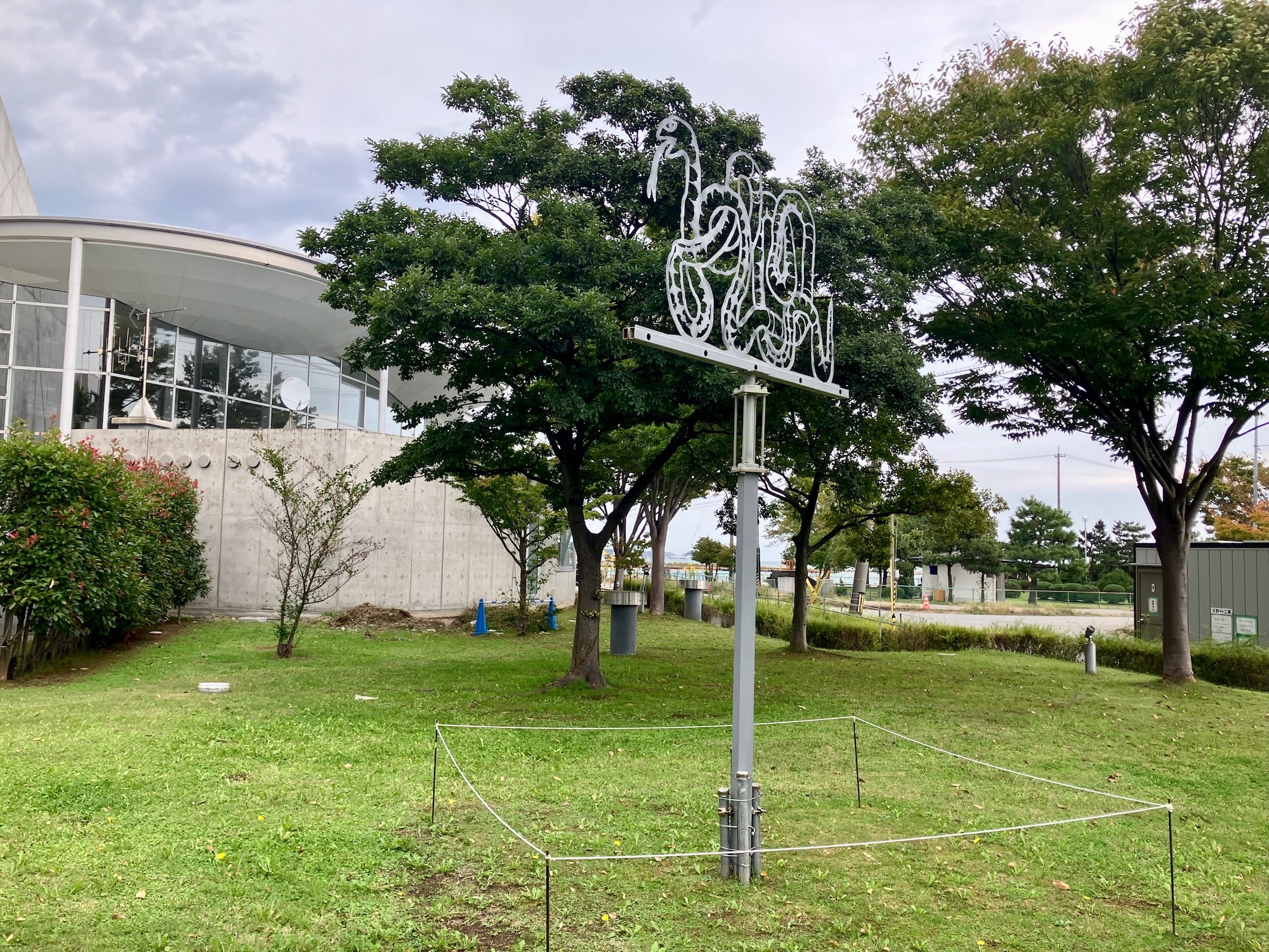 ラポルトすずの庭には、展覧会の会期中、SIDE COREの作品《blowin' in the wind》が展示されている。本作は2023年の「奥能登国際芸術祭」で発表され、当時はここから見える山の風力発電所内に設置されていた。風力発電機は100mもの高さのある巨大な構造物だが、市民の生活圏から離れた場所にあるため、近くに行ったことがない人も多い。そこで彼らは発電機に着想を得た大きな「風見鶏」を発電機の近くに設置。山道を通ってその場に行くこと自体を作品の一部とする展示を行った。
