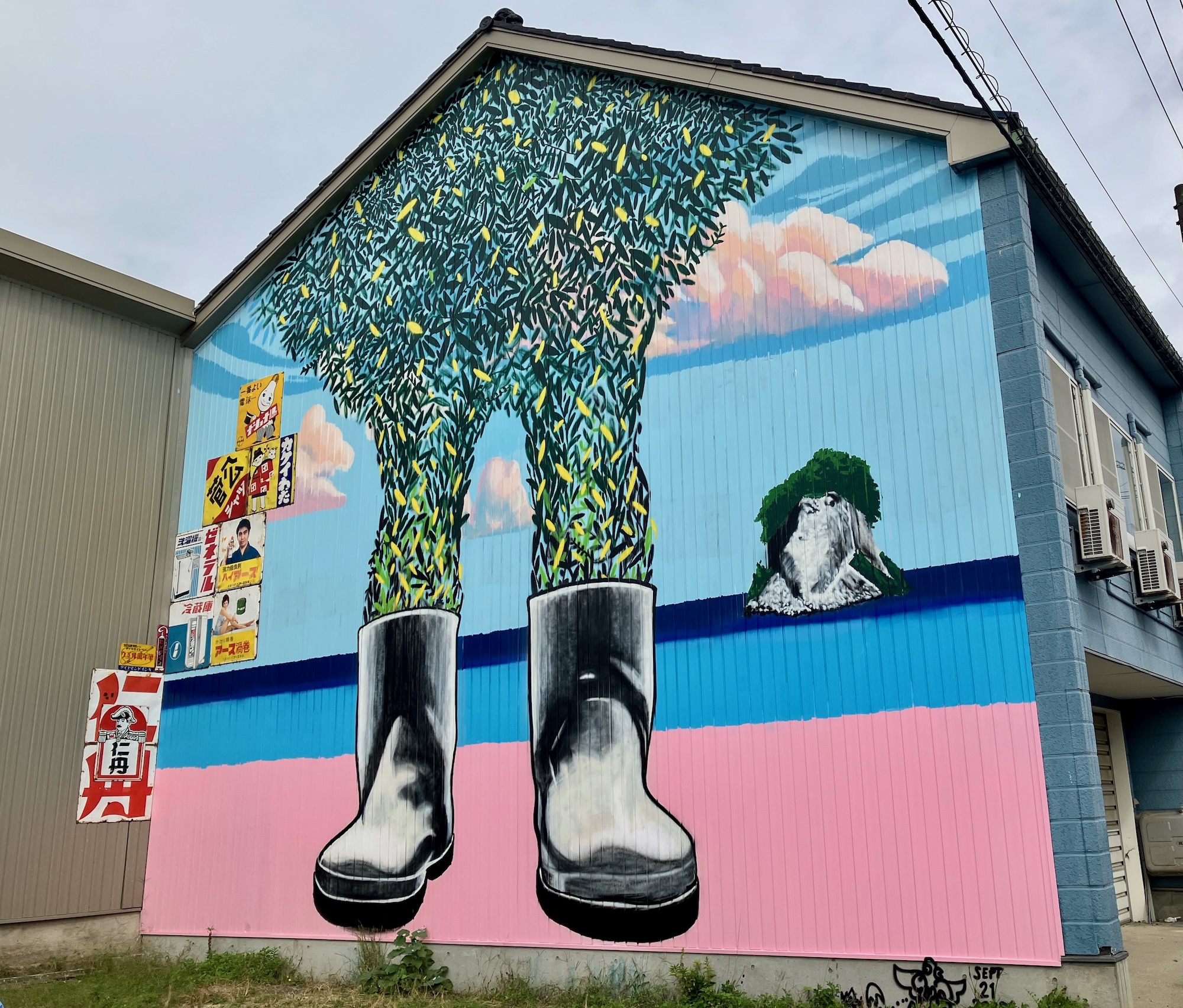 ピンクと青の空と海を背景に、長靴から植物のような模様が湧き出ているESPOの作品は、力強い生命力を感じさせる。作家が今夏に珠洲を訪れ、ピンクに染まる珠洲の夕方の雲にインスピレーションを受け、この風景を描いた。海の向こうには、街のシンボルでもある見附島の、震災で崩れる前の姿が描かれている。