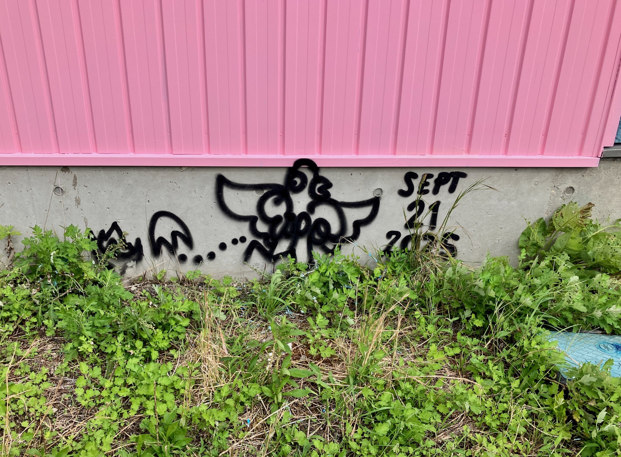 作家のふだんの計画的な制作過程とは異なり、この壁画は即興的に徐々に描かれていった。偶然にも絵を描き終わった日は、震災後に発生した豪雨からちょうど1年が経った日で、右下に制作日とサインが入っている。作品の完成後、自分の家に描いて欲しいと言ってきた地元住人も複数いたそうだ。