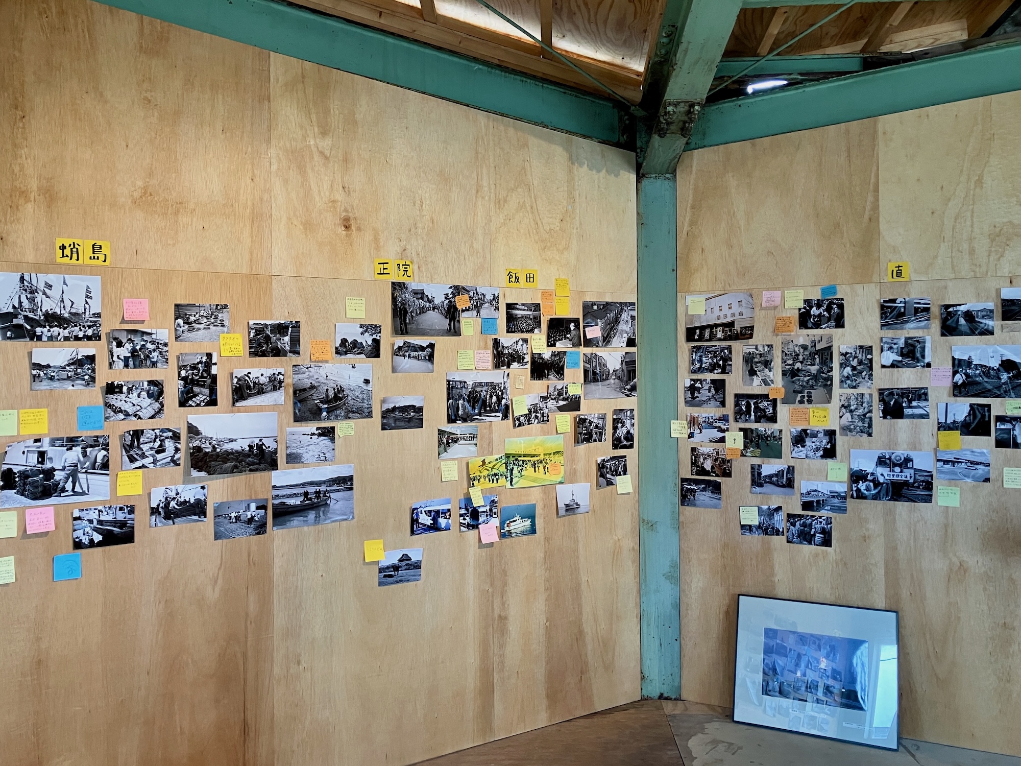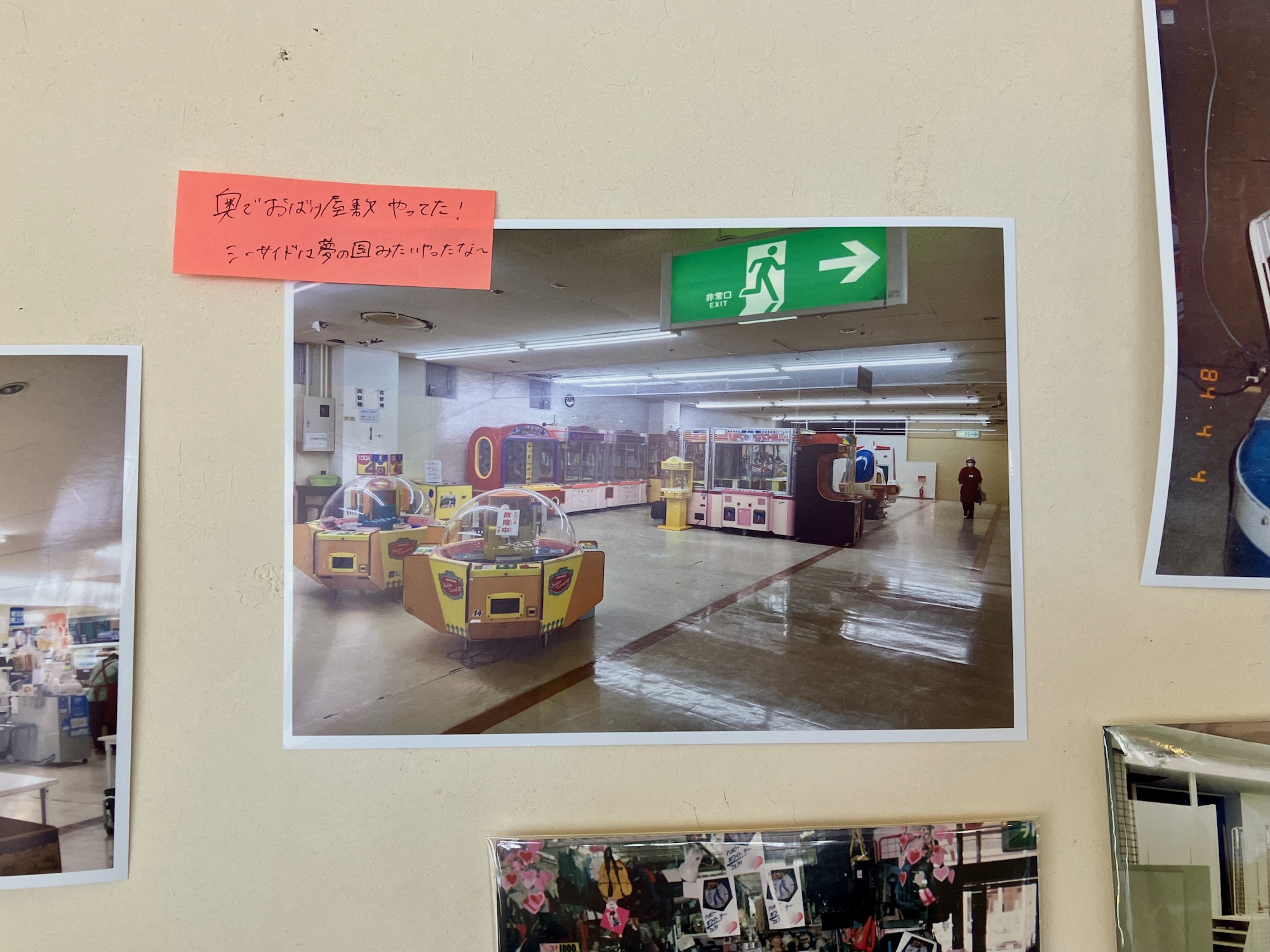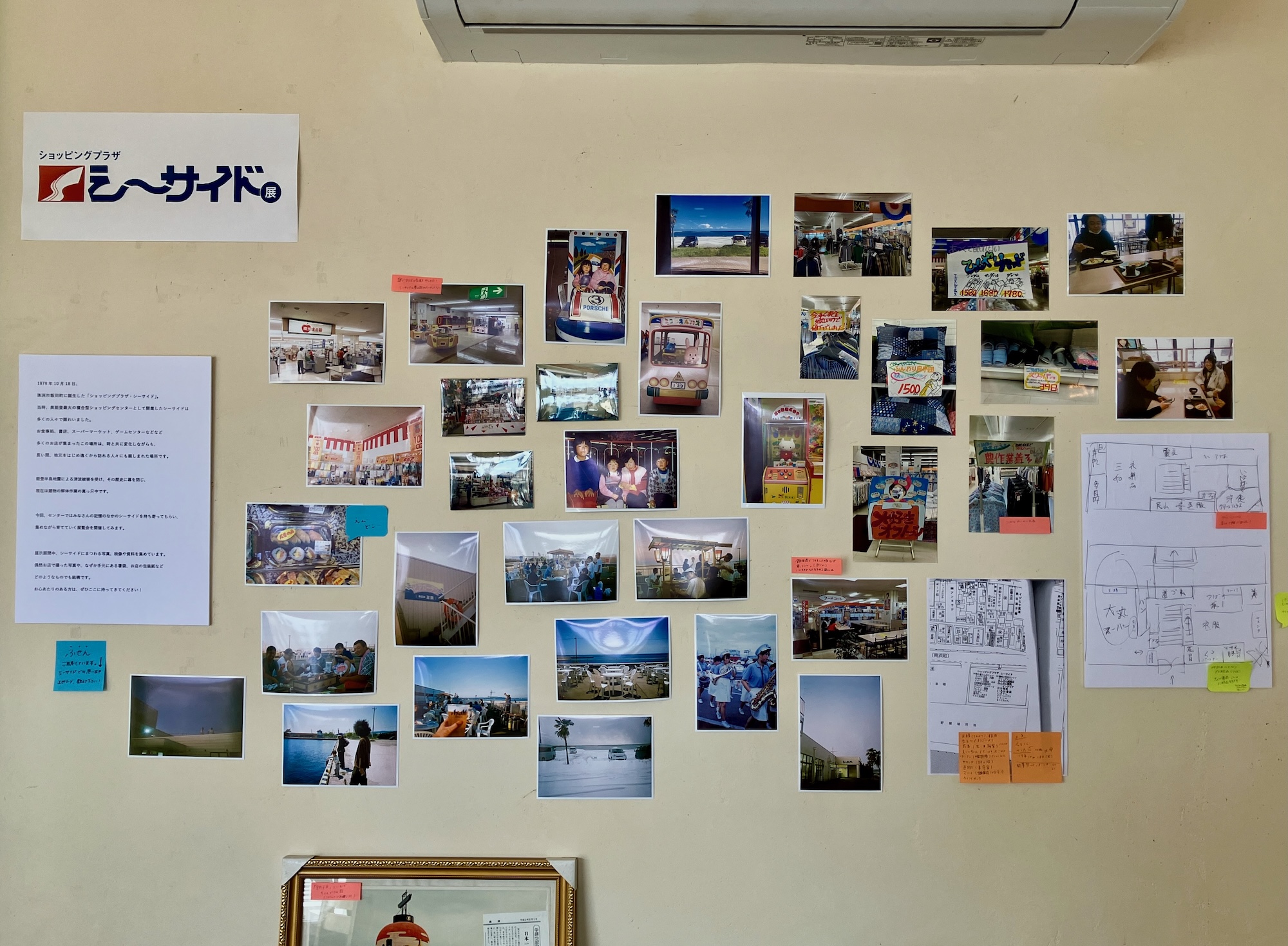 このときは、かつて港にあったショッピングプラザ「シーサイド」の展覧会が行われていた。シーサイドには、レストランや書店、スーパーなど様々な店舗が入居し、SIDE COREメンバーもよくランチなどで利用していたというが、震災で津波による甚大な被害を受け、現在は解体作業が進む。本展では地元の人々から募ったシーサイドにまつわる思い出の写真を展示。ゲームセンターで遊ぶ子供や食事をとる人々の姿、店内のポップ、雪景色の駐車場など、一人ひとりの記憶のなかにあるシーサイドが断片的に可視化される。添えられた付箋に綴られたエピソードや、食事処の箸袋、コーヒーチケット、ポイントカードといった資料からも、かつてこの場所にあった人々の賑わいが伝わってくる。