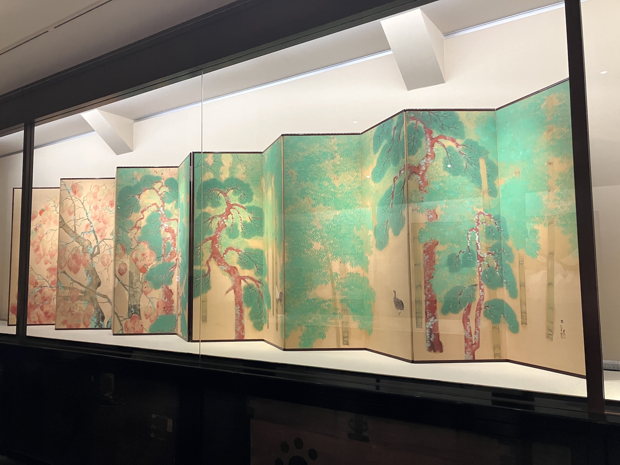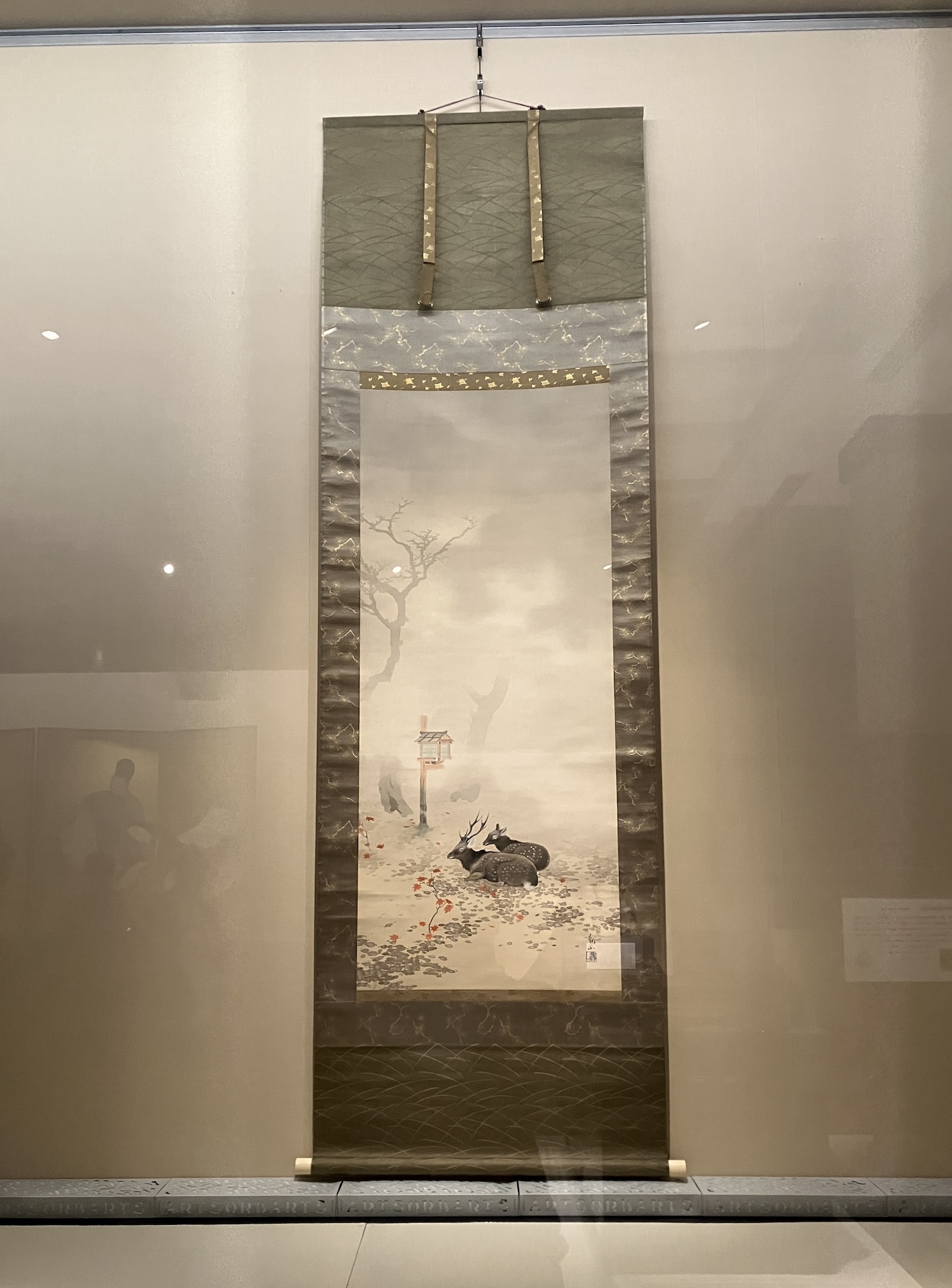 琳派からの影響が見られる大観の屏風作品《柿紅葉》や、奈良・春日大社に佇む鹿を描いた観山の《春日の朝》など、秋の情緒を感じさせる作品が並ぶ。