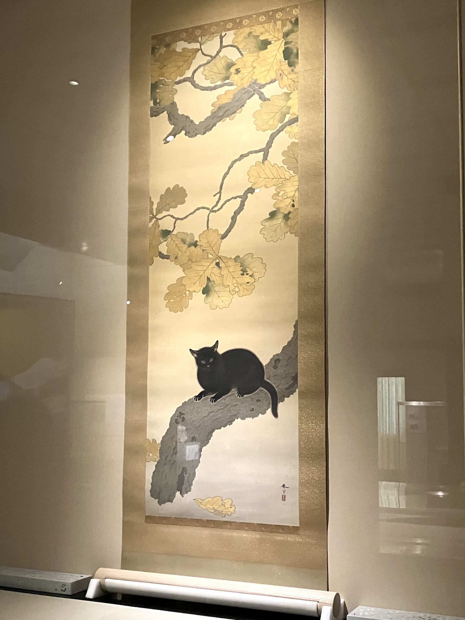 当初は中国の古い絵画を手本とし、ぶち猫を多く描いていたが、33〜34歳頃から黒猫を描くようになり表現を発展させていく。なかでも完成度の高い作品として知られる《黒き猫》は、金泥や青緑を用いて平面的に描かれた柏の葉と、写実的な猫の対比が印象的。猫のふわふわとした毛並みが墨のぼかしのみで表現されており、その手触りを思い起こさせるようだ。さらに墨の濃淡で猫の立体感を表すなど、様々な表現の試みが行われている。