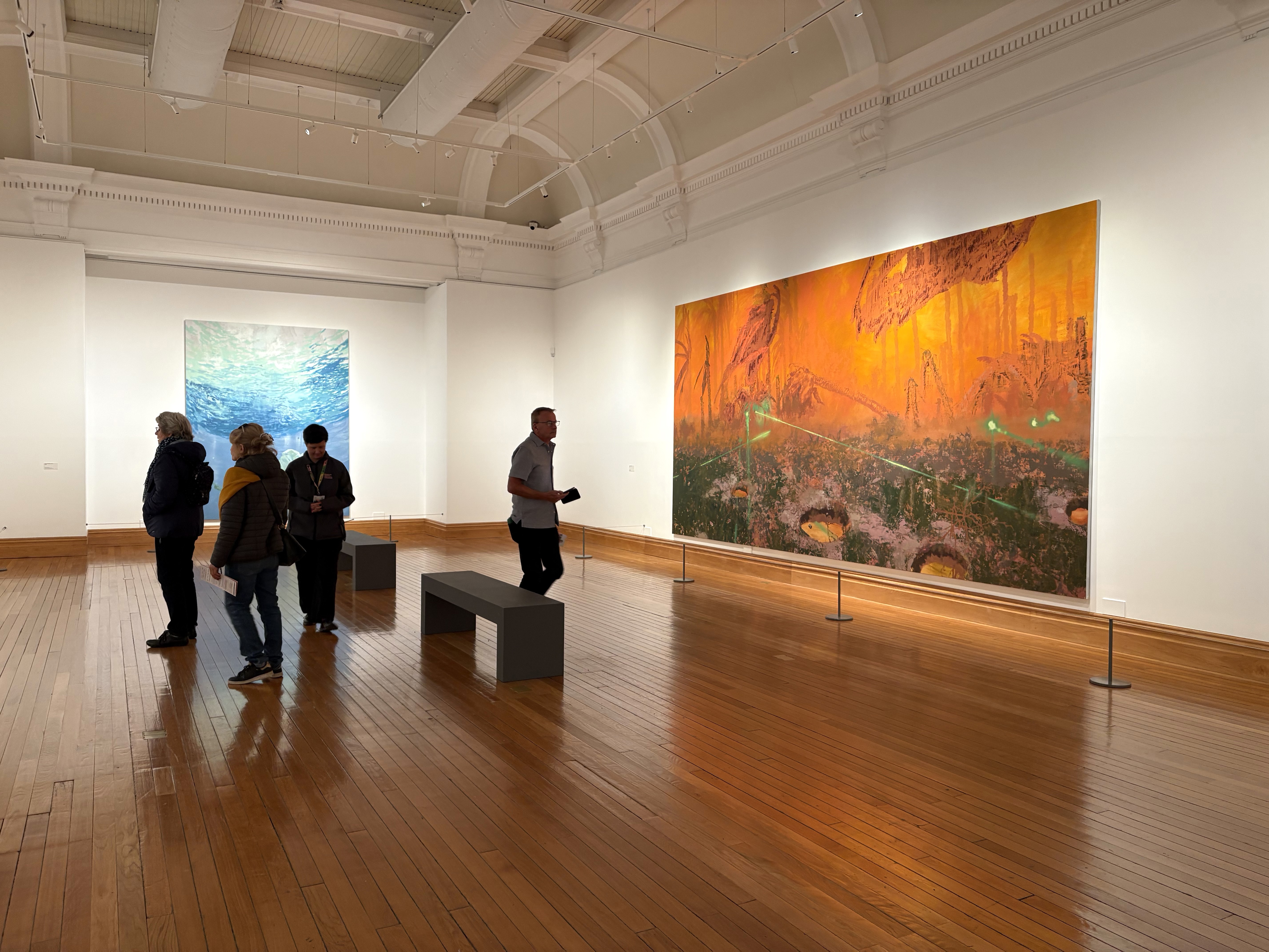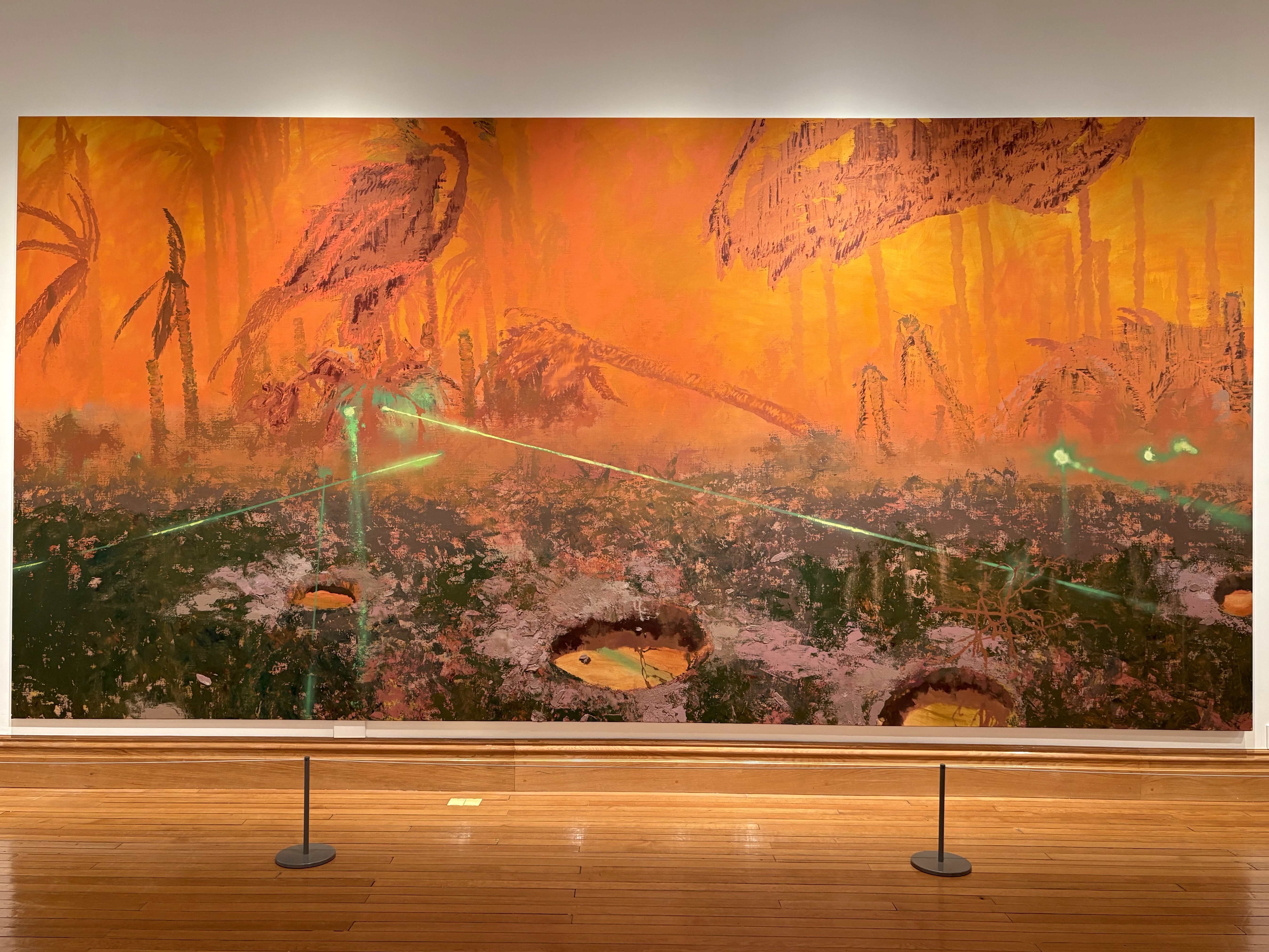 サーミの絵画を特徴づけるのは、第一にその圧倒的なスケールである。視野を覆い尽くすほどの大画面はIMAXのスクリーンを思わせ、鑑賞者を否応なく作品へ引き込む。そしてもうひとつの特徴は、人間の不在である。多くの場合、人の姿は描かれず、登場するとしても顔は省略され、匿名的な存在として処理される。彼の風景画は、かつてそこに人がいたのではないか、あるいはいまもどこかに潜んでいるのではないかという気配を漂わせ、漠然とした不安を呼び起こす。