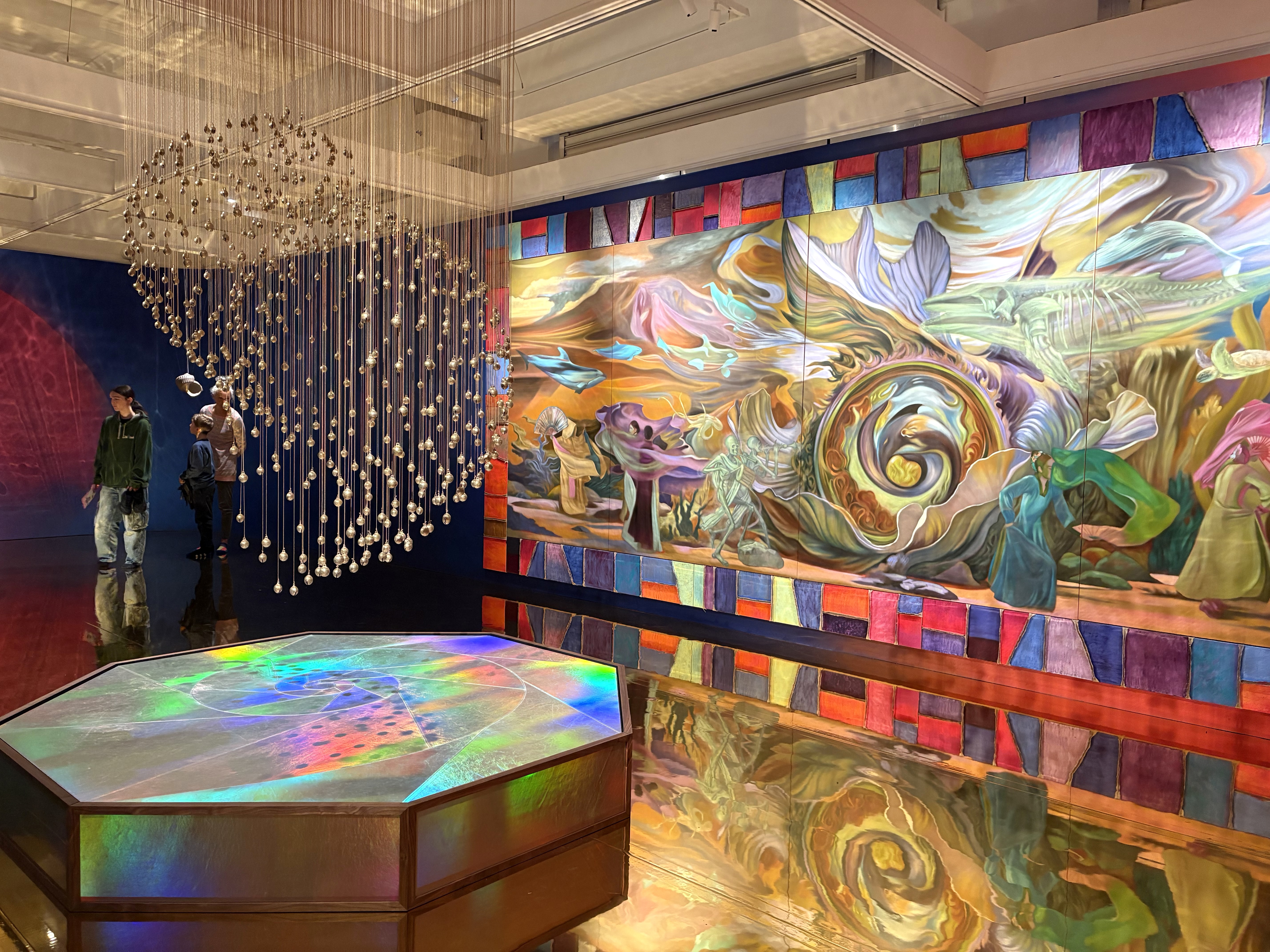 入口で靴を脱ぐように促され、展示室へ入ると、まずは虹色のプリズムが煌めく螺鈿細工のような八角形の台座と、その上部で螺旋状に吊るされた数百個の鈴《Ghost》が目に入る。あたり一面ゴールドのシートで覆われた床は、水面のように絵画を反射し、照明の光を受けて壁にはキラキラと輝く波紋が広がる。それは、どこか夢見心地のような、この世とあの世のあわいにいるような感覚を呼び起こす。しかし、不思議と恐ろしさは感じず、むしろ観客を抱きしめるような温かさに満ちているのが印象的だ。