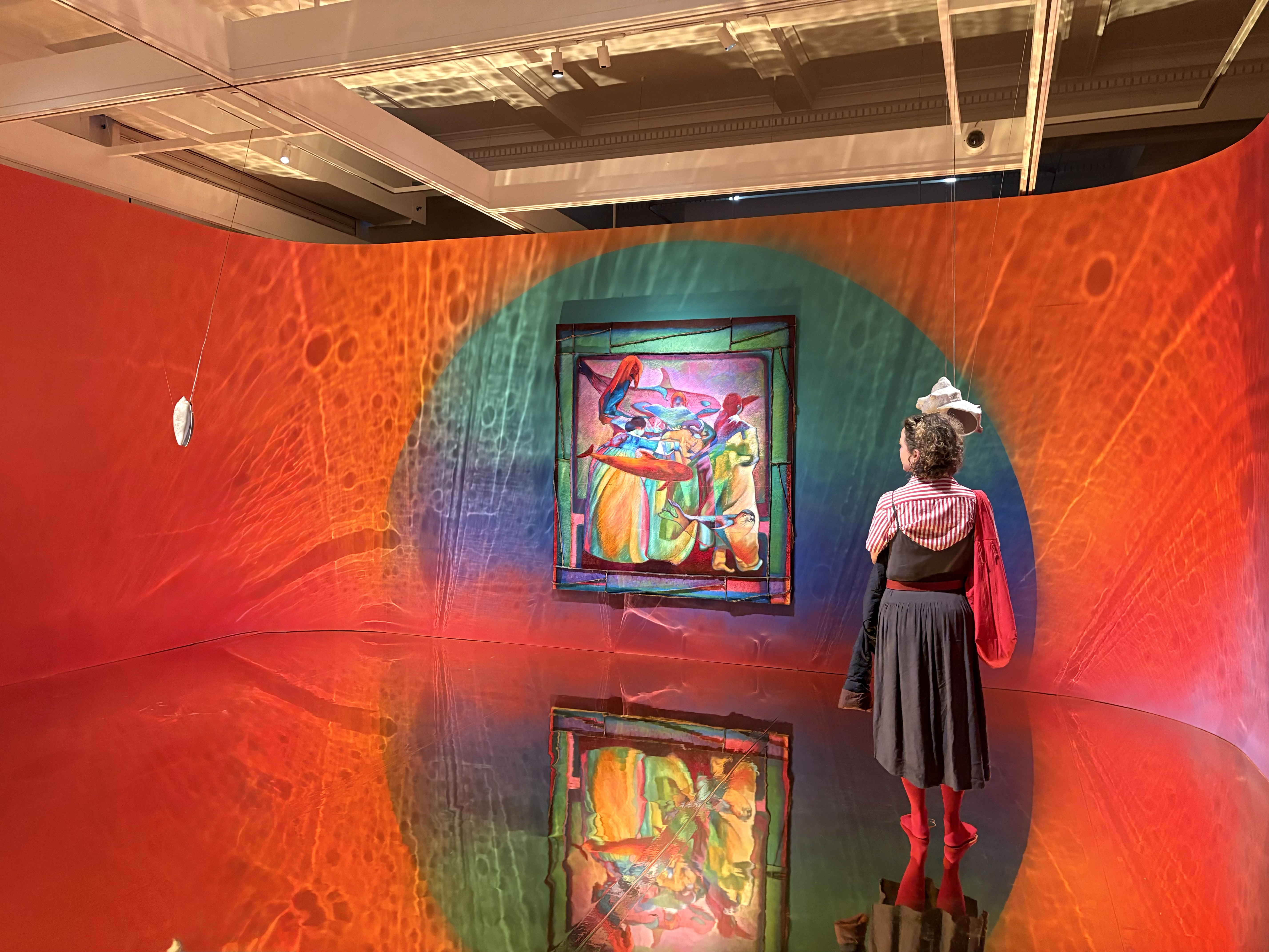 四隅に設置された貝殻型スピーカーに耳を澄ませると、海のさざめきやアンビエントミュージックに混ざって、オクティヴィア・E・バトラー、アーシュラ・K・ル=グウィン、アリス・ウォーカーといった女性作家たちの優しく語りかける声が響く。また、中央の鈴を囲むように、壁面には韓国伝統工芸ポジャギを連想させる色彩豊かな絵画が掲げられ、そこではムーダン(巫女)たちが海洋生物とともに舞う幻想的な光景が描かれている。
