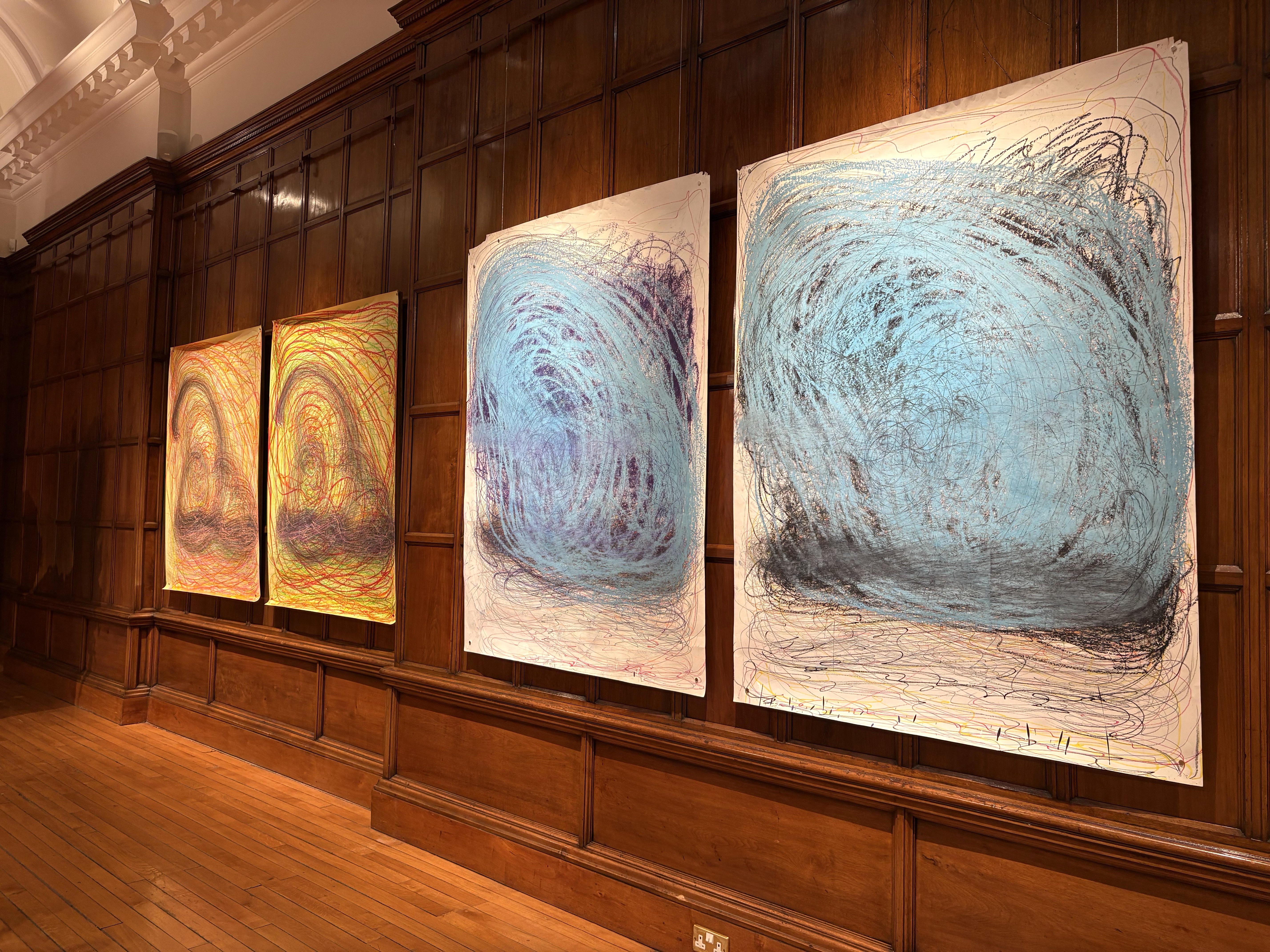 興味深いのは、ダクトホースに素材を巻き付けるという同円心状の腕の反復動作が、ドローイングにおいて渦巻き状の線描として再現されている点だ。立体作品で実践された不可視の身体性が、幾重もの線の痕跡として平面上で前景化するのである。平面と立体という形態の違いはあれど、両者がカルーの制作において密に結びついていることが伺える。彼女のドローイングは2枚1組、あるいは3枚1組で展示されることが多く、それらの組絵は一見するとコピーしたかのように似通って見える。カルーの反復と集積が、闇雲な繰り返しではなく、かなり精度の高い反復動作を再現できる証左であり、それは瞠目に値する。