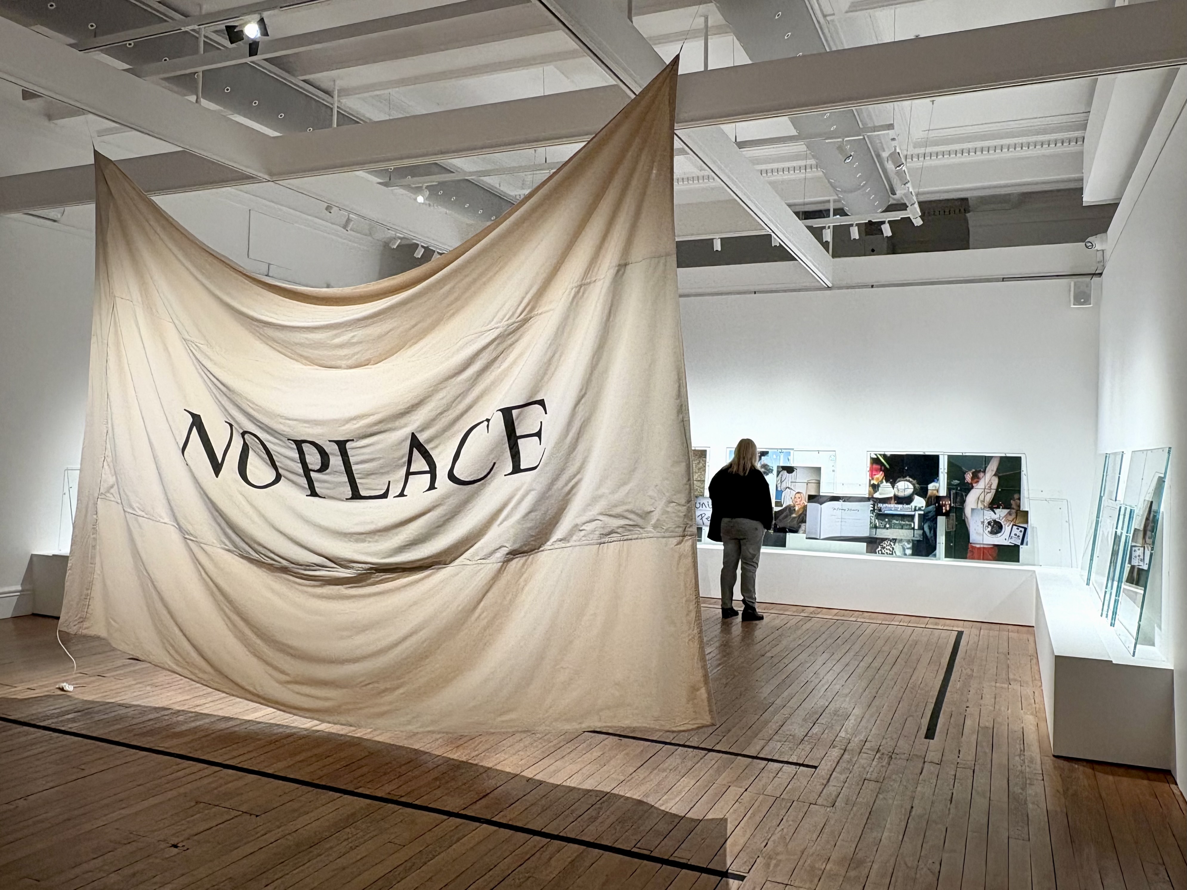その奥へ進むと、<居場所がない(No Place)>と書かれた横断幕が天井から床まで垂れ下がる。背後で流れるオーディオ作品《365》は、「Free Palestine」のチャントに加え、教会の鐘の音や讃美歌、トランスジェンダー権利活動家の抗議の声、黒人女性フェミニストであるベル・フックスの声が順番に響き渡り、冒頭の写真で示されたナショナリズム的なイメージと相まって、<居場所がない>という言葉はより切実な意味を帯びていく。