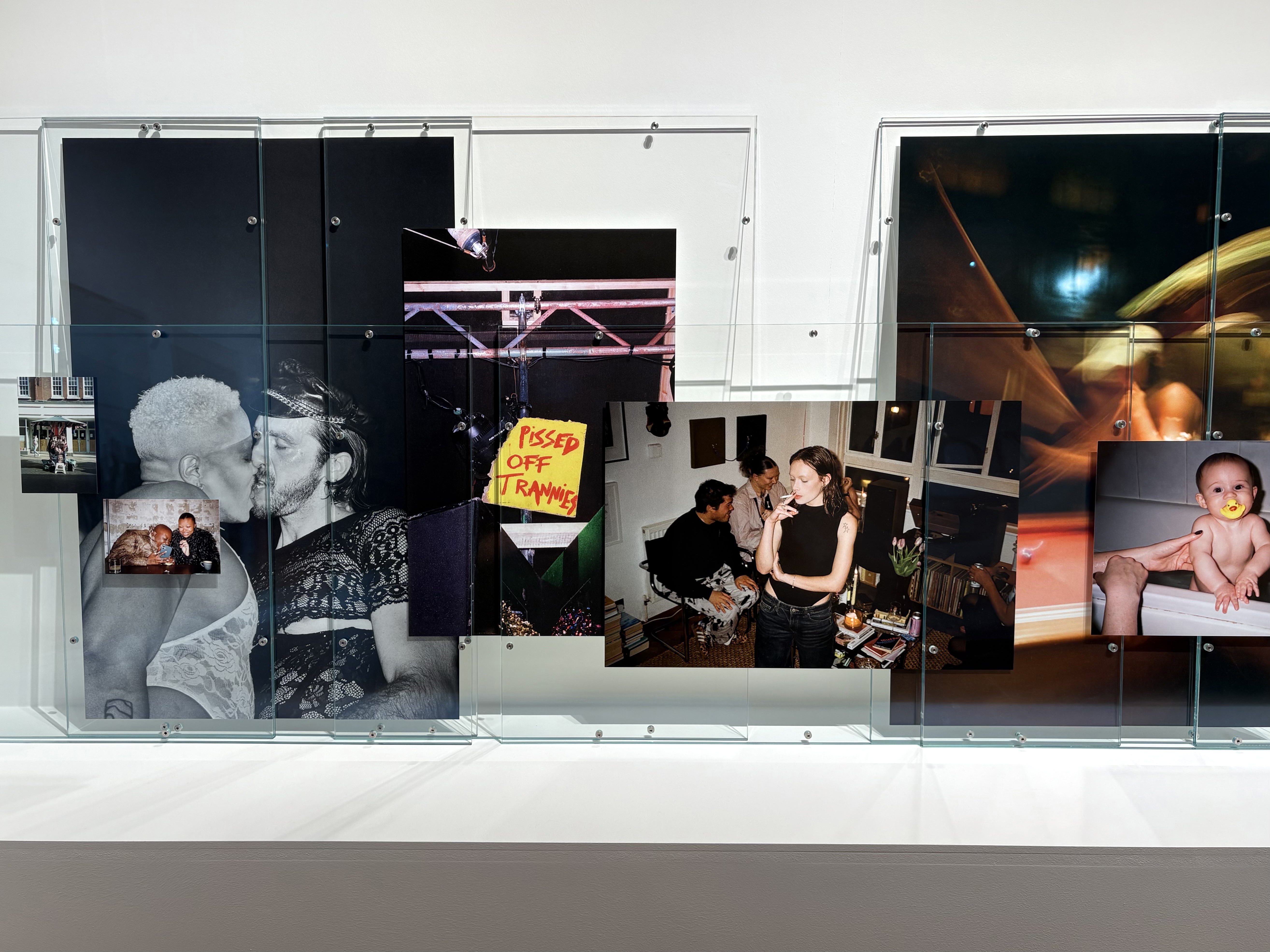 さらに裏に回ると、横断幕の反対側にFor Violenceという語が現れた。つまり、表裏で<暴力に居場所はない(No Place for Violence)>というフレーズが完成する。そして、このFor Violenceの文字をコの字型に囲むのが、写真シリーズ《Feeling Wheel》だ。大小様々な40枚の写真がアクリル額装でレイヤーのように重なり合い、まるで複数のウィンドウを広げたデスクトップ画面のように見える。そのなかには、「怒り狂ってるトランス連中(Pissed off trannies)」といった街頭の差別的な落書きの写真と、マティックの友人をとらえたプライベートで親密な、優しさと愛情に満ちた写真が並置され、両者のモンタージュによって、<暴力に居場所はない>というメッセージが一層強調される仕掛けになっている。全体的にかなりシステマチックなプレゼンテーションだ。