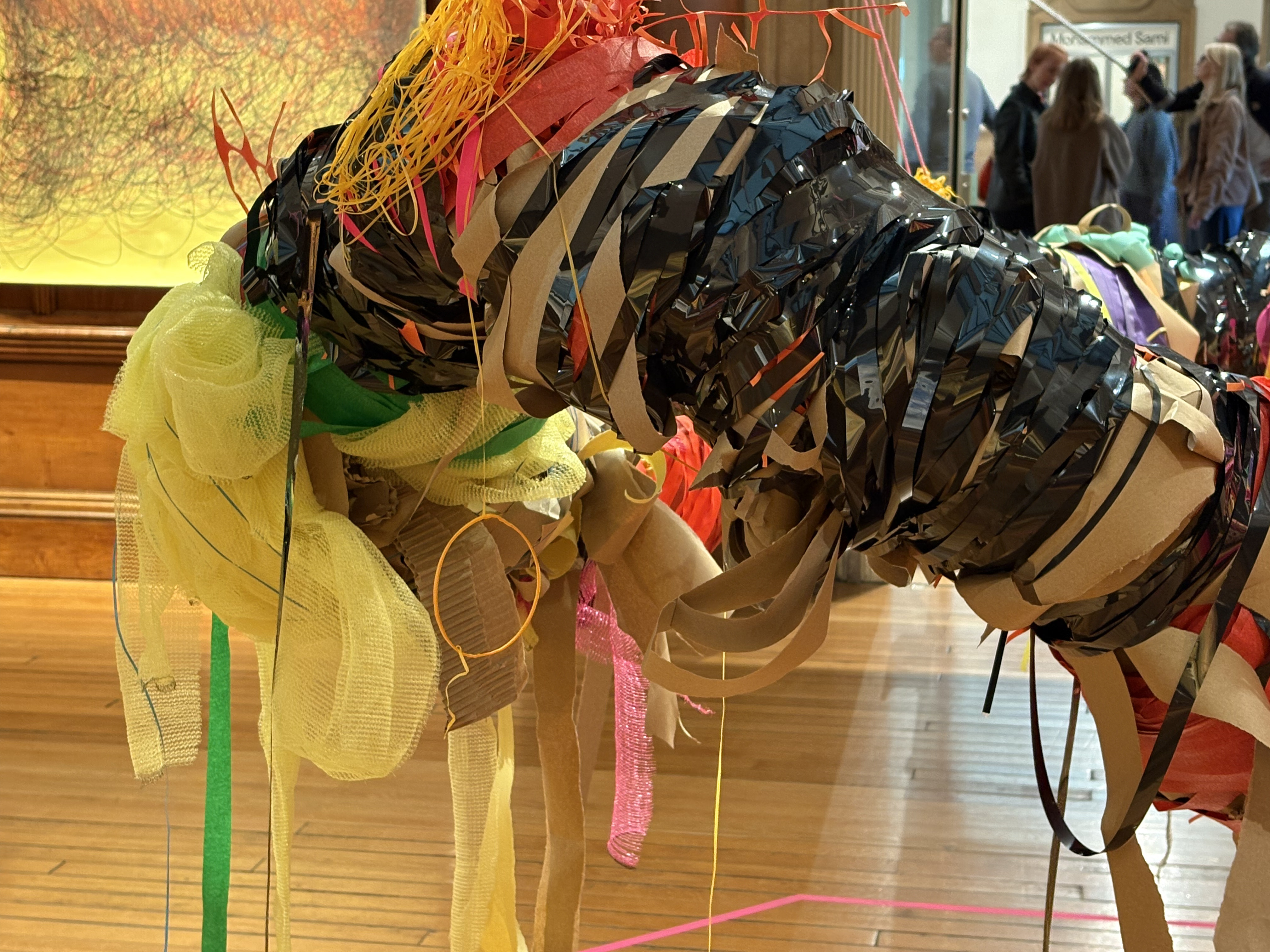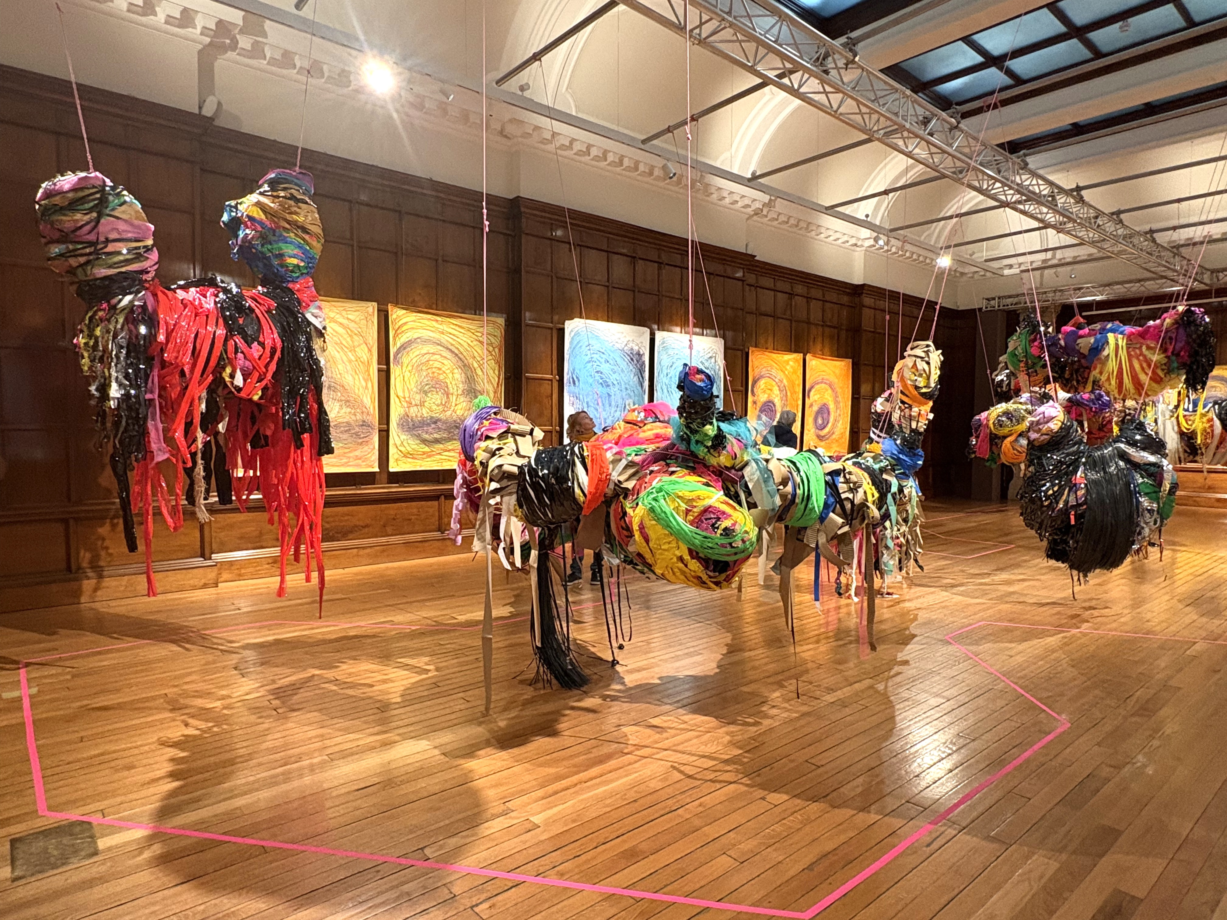 カルーは、プラスチックのダクトホースを素体に、布、ロープ、ビニールテープ、ラップ、紙、VHSテープなど身近な素材をぐるぐると巻き付けることによって、カラフルで有機的な立体作品を生み出す。その形態は、まるで人間が捨てた有り合わせの人工物で親鳥が作る巣のようで、彼女にとっての心理的な安全領域を象徴しているように感じる。と同時に、言語でのコミュニケーションが極めて限定的なカルーにとって、制作と発表は世界と関わるための手段であり、同時にセルフケアでもあるのだと強く意識させられる。作品から垂れ下がった素材は、人が通るたびに風に揺れ、作品が鑑賞者と非言語のコミュニケーションを試みているようにも思えた。