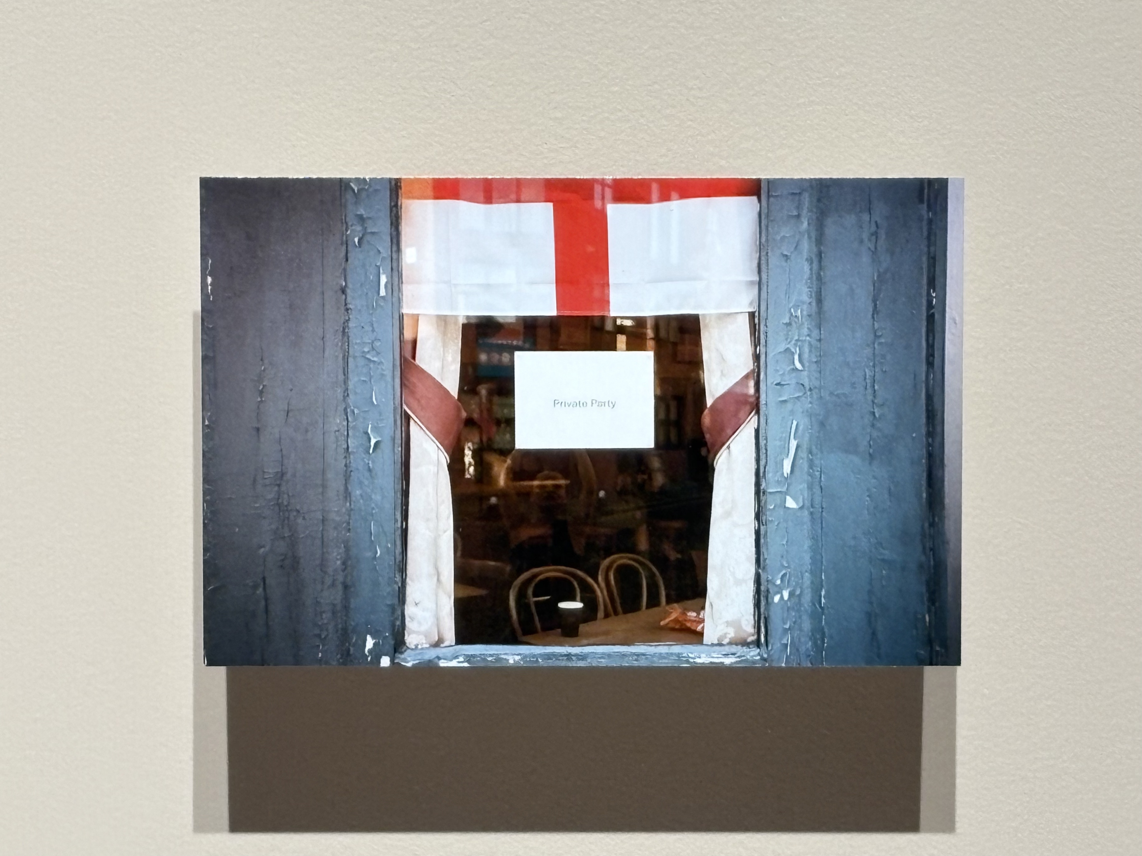 「パレスチナに自由を(Free Palestine)」というチャントが響き渡る展示室に足を踏み入れると、まず出会うのは、パブの窓にイングランド国旗を写した1枚のL版写真だ。国旗の下には<プライベートパーティー>の表示が掲示され、反移民の愛国主義的なデモ参加者がこの国旗を携えて行進していることを考えれば「イギリス人以外お断り」とも読める排他的な含意が漂う。