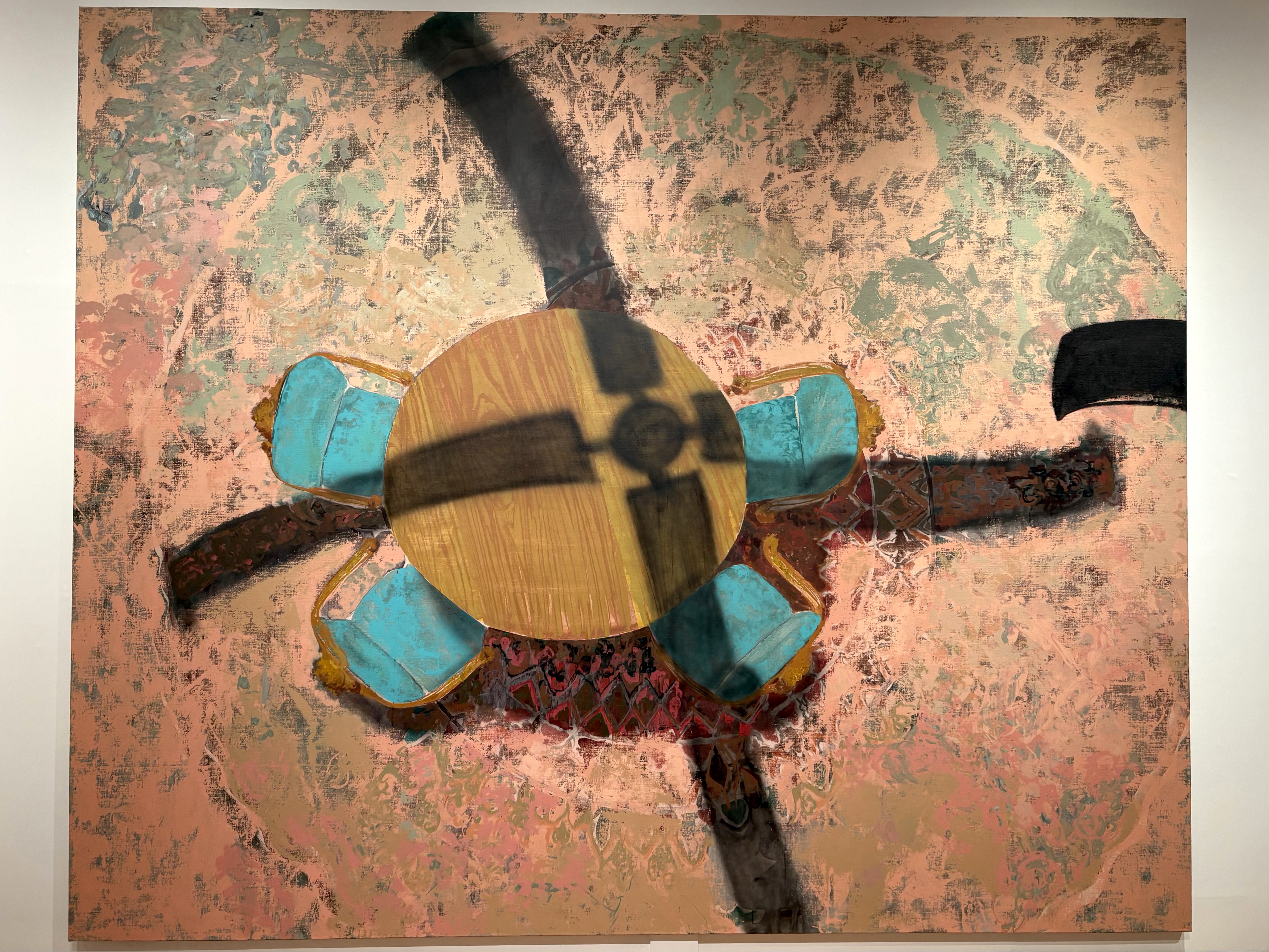 たとえば、《The Grinder》では、円卓と四脚の椅子がドローン視点のように俯瞰され、不穏な影——シーリングファンか、ヘリコプターのブレードか、あるいはまったく別の何か——が旋回している。かつては美しいモザイクタイルであっただろう床は砂埃をかぶり、ところどころに残された足跡によって幾何学模様が断片的に姿を現す。その足跡は、この情景が何かが起こったあとの痕跡なのか、あるいは嵐の前の静けさで逃げた人々が息を潜めている状況なのかを曖昧にしている。